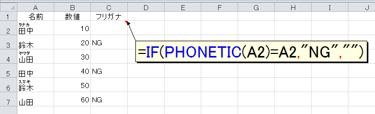 - セルに入力されている文字列ではなかったら → フリガナが設定されている