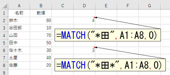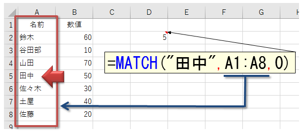 上記の例でMATCH関数が返す「5」は、見つかった"田中"がセルA5(ワークシートの5行目)だから「5」なのではなく、引数「検査範囲」で指定したセル範囲A1:A8