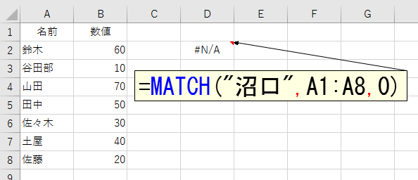 「検査値」が見つからないと、MATCH関数はエラーを返します。