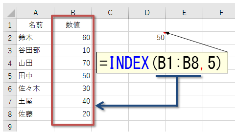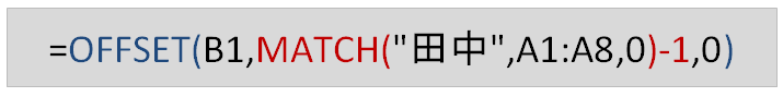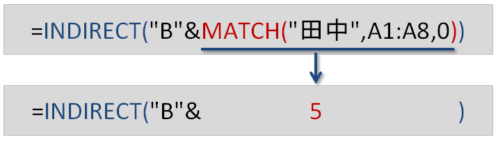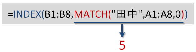 4つ下のセルという意味です。MATCH関数を使うと、"田中"はセル範囲A1:A8内で「上から5個目」というのが分かります。INDEX関数に引き渡してやるのは、この「5」から1を引いた数値です。