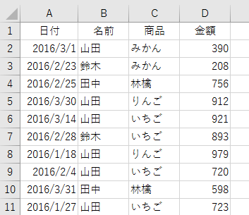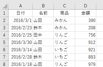 こんなデータが大量にあったとします。この中から「名前」が"田中"の「商品」"りんご"だけ、全部"林檎"に置換したいんです。こういうケース、実務ではけっこう多いです。普通に置換機能を使ったら、すべての"りんご"が置換の対象になってしまいます。