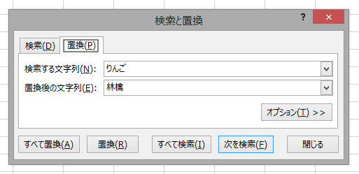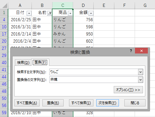 次に、C列全体を選択してから、"りんご"を"林檎"に[すべて置換]します。