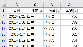 オートフィルタを解除してみれば、ご覧の通り。「名前」が"田中"ではない"りんご"は置換されていません。