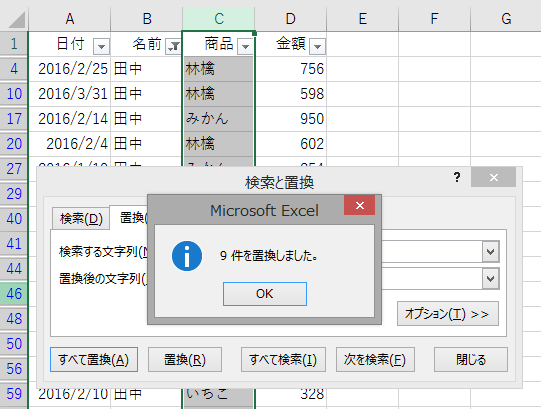 これで終わりです。オートフィルタで絞り込んだ結果に対して置換すると、絞り込まれた結果だけが置換対象になります。