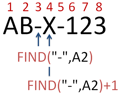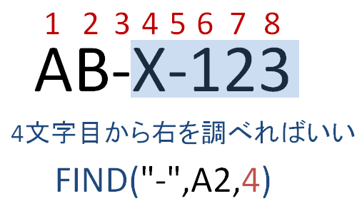 最初に見つかるハイフン(-)の位置(ここでは3文字目)の、ひとつ右隣なのですから、1を足した文字位置です。