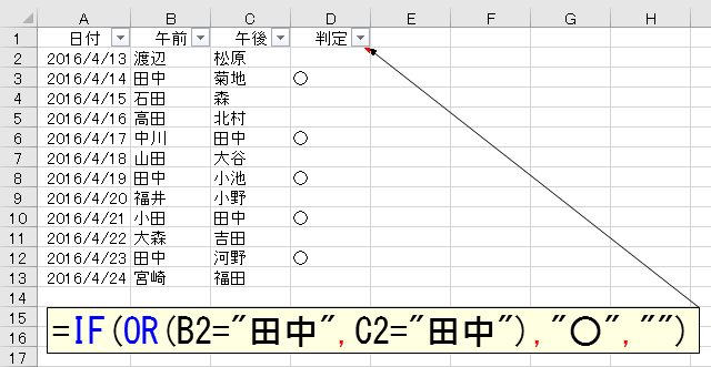 複数列をORで絞り込むことができません。たとえば、上のようなリストで、B列の「午前」が"田中"である、