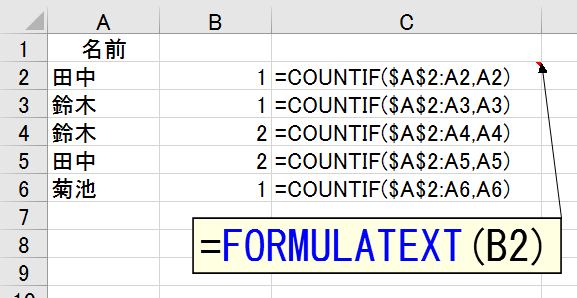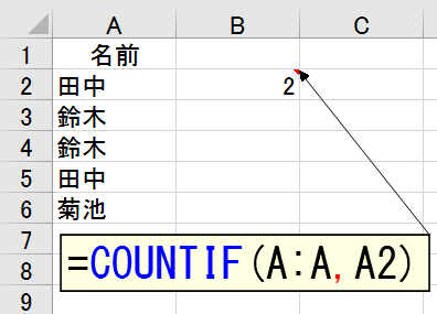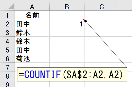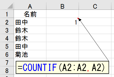 では、これらの数式をB列に入力してみましょう。まず、セルB2に「=COUNTIF(A2:A2,A2)」と入力します。