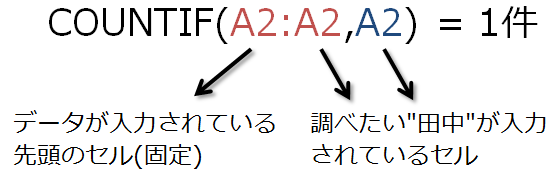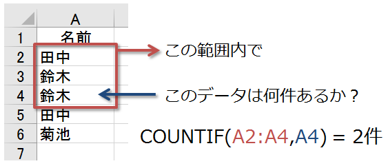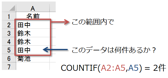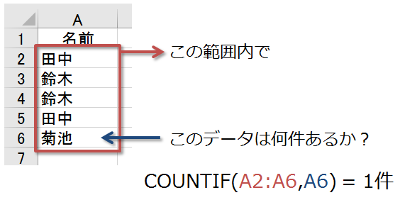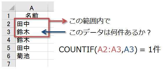 さあ、重複しない名前の件数を調べるには、どうしたらいいでしょう。こんなときは、次のように考えます。分かりやすく2行目の"鈴木"からやってみましょう。先頭の"田中"は、後で考えます。