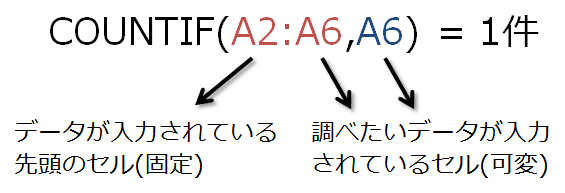 A6:A6,A6)」ですが、調べる先頭のセルA2は固定されていなければいけないんですね。こんなときは、