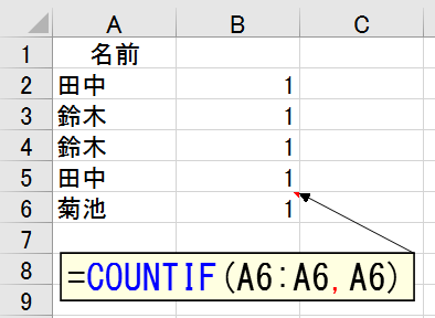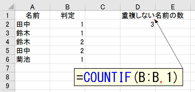 1 ということは、その名前は、そこまでの間で、初めて登場したということです。したがって、COUNTIF関数で調べたB列の中で 1 の個数が、重複しない名前の個数ということになります。
