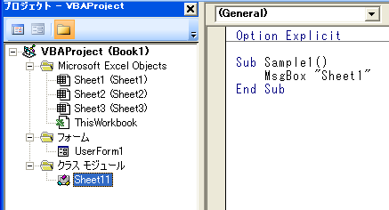 Excelの標準的な仕様では、新しいブックに3枚のワークシート(Sheet1〜Sheet3)が用意されます。これら各ワークシートにもマクロを記述するモジュールがあります。また、ブックそのものを表すThisWorkbookというモジュールも存在します。こうしたオブジェクトモジュールは、セルを選択したとき自動的に実行されるマクロを作成したり、ブックを開いたとき自動実行されるマクロを作成したりします。