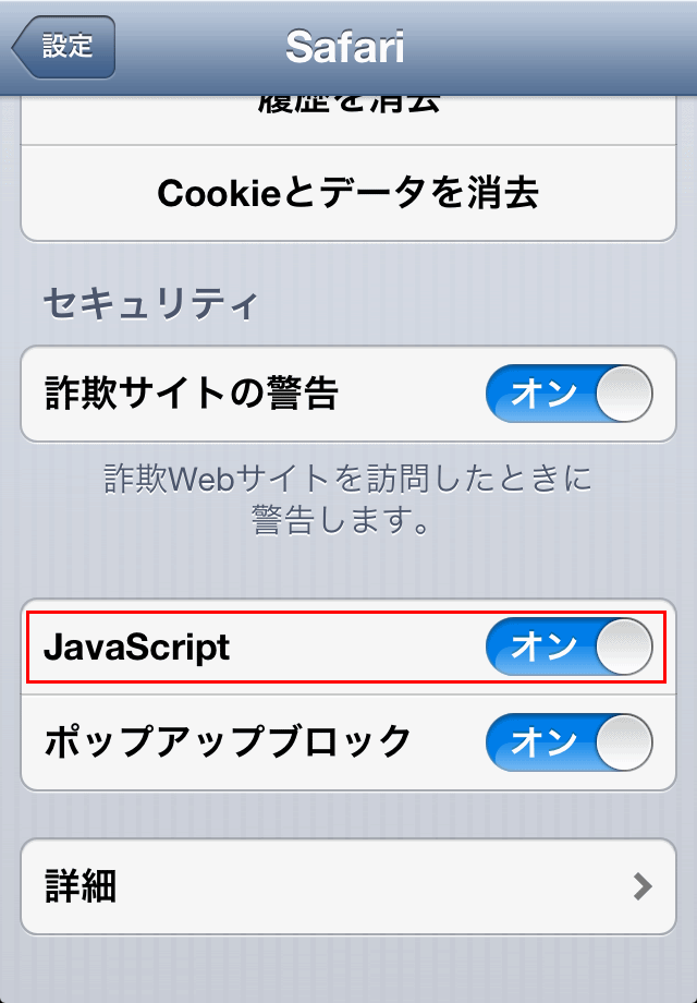 設定のSafariを開きます。 JavaScriptという項目があるので、ここで有効/無効を切り替えします。