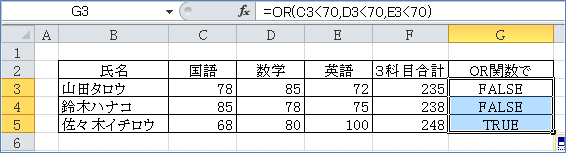 同様にして、論理式2に D3<70 と入力。論理式3に E3<70 と入力。