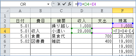 すると、まだ記載のない行にも残高が入ってしまいます。 (4)なので「収入」も「支出」もゼロだったら空白を表示して、そうでない場合に は残高の計算結果を表示させるようにします。 =IF(論理式,真の場合,偽の場合)ですから =IF(AND(D4=0,E4=0),"",F3+D4-E4)このような式になります。 (5)(2)で入力したF4セルの数式を利用して、(4)の式を入力してみましょう。 関数を組み合わせて使う場合は、直接数式バーで入力するほうが簡単です。 まず、F4セルを選択して、数式バーの「=」のすぐ右にカーソルを入れます。
