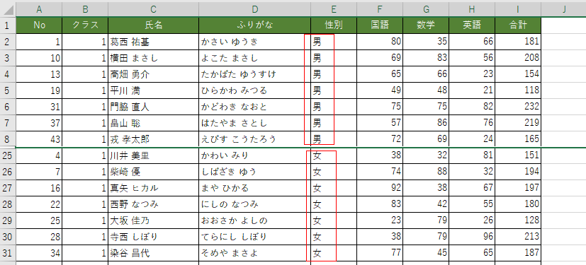 例えば、下図のようなクラ順準に並んだデータがあります。男女別の集計をしたいときは下記の手順になります。