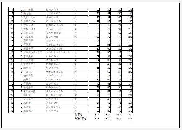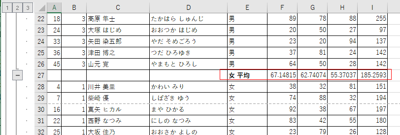 - 「男」や「女」のデータの最終行に集計(平均)値が挿入されます。なお、桁数は小数点以下1桁に調整しています。