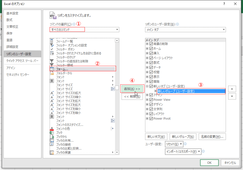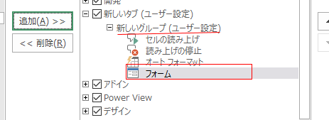 - 新しいタブをリボンにh逃避するには先頭のチェックボックスにチェックを入れる必要があります。
