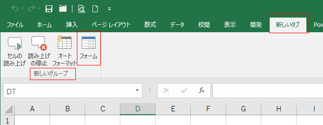 - リボンの[新しいタブ]をクリックすると、新しいグループに[フォーム]コマンドが配置されているのを確認することができます。