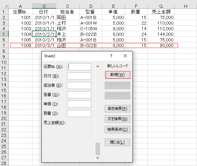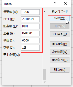 - [新規]ボタンをクリックすると、入力したデータがシートに追加されました。