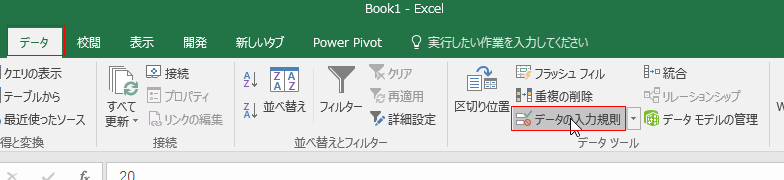 セルを選択して、[データ]タブのデータツールグループにある[データの入力規則]を実行します。