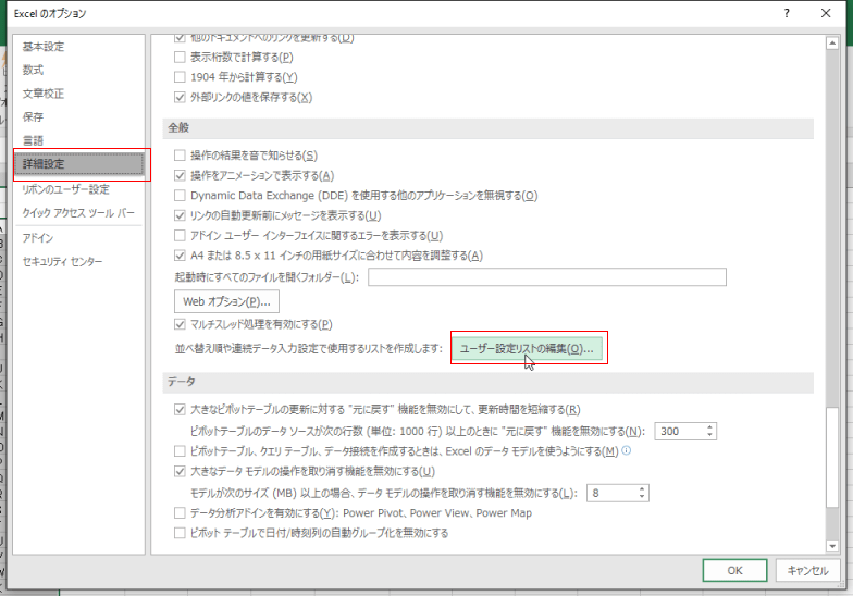 「全般」の「並べ替え順や連続データ入力設定で使用するリストを作成しましす。の[ユーザー設定リストの編集]ボタンをクリックします。