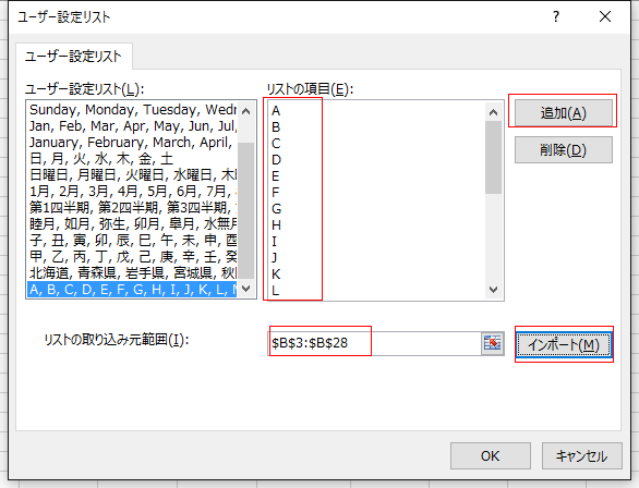 [インポート]ボタンをクリックすると、リストの項目に選択していた範囲のセルの値が表示されます。
