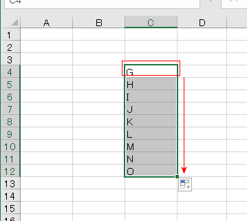 - セルに「G」と入力して、下方向にオートフィルしました。