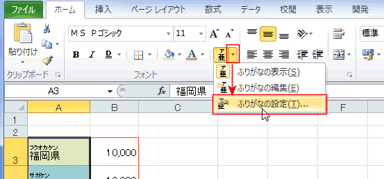 - [ふりがなの表示/非表示]ボタンの右の▼をクリックして[ふりがなの設定]を実行します。