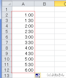 B列にキーボードから「1:00」「1:30」「2:00」・・・と入力します。