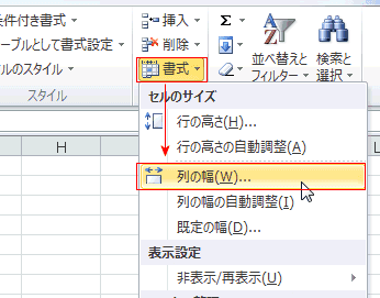 - [ホーム]タブの「セル」グループにある[書式]→[列の幅]を実行します。