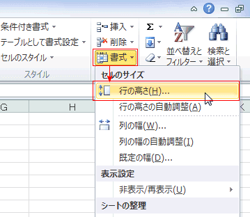 - [ホーム]タブの「セル」グループにある[書式]→[行の高さ]を実行します。