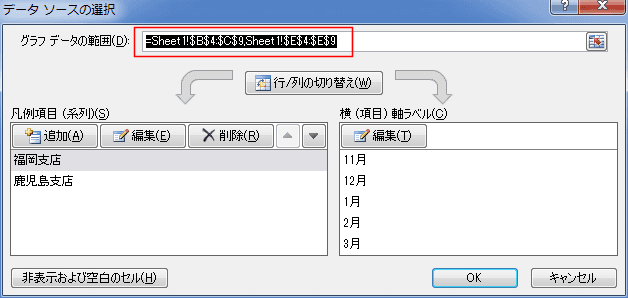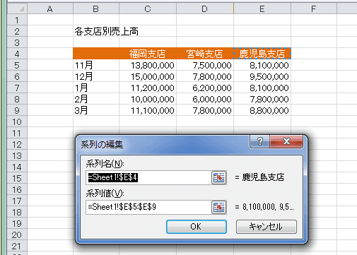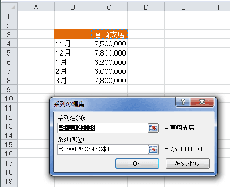 - データのあるシートがアクティブになり、系列名と系列値のセル範囲が表示されました。