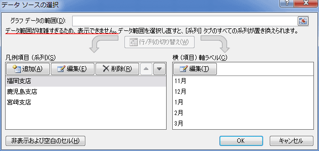 - [データの選択]を実行すると、「データ範囲が複雑すぎるため、表示できません」と表示されてしまいました。