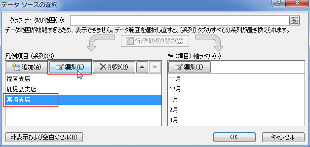 - 凡例項目(系列)で調べたい系列を選択して、[編優]ボタンをクリックします。