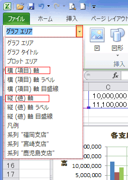 - グラフ要素のドロップダウンリストで変更したい軸を選択します。