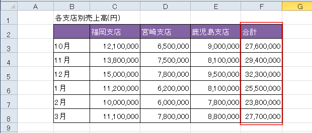 - C3:E8のデータ部分のセルの表示形式には桁区切りを設定しています。