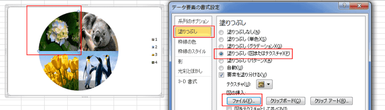 よねさんのExcelとWordの使い方|エクセル2010基本講座:目次|グラフの使い方|図(写真や画像)や図形の操作|グラフを利用して画像を切り替える(円グラフ)