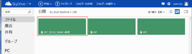 - SkyDriveへ接続されました。[ファイル]を選択すると各フォルダ(場所)が表示されした。