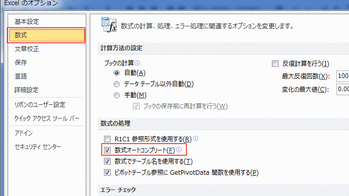 - チェックボックスのチェックを外すと数式オートコンプリートがオフになります。