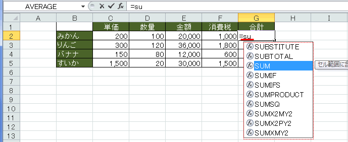 - 下にSUで始まる関数の一覧が表示され、キーボードのカーソルキー[↓]で選択します。すると関数の説明がポップアップで表示されます。