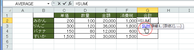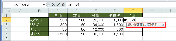 - SUMを選択した状態で、キーボードの[Tab]キーを押すと、SUM関数が入力され、関数の書式のヒントが表示されます。