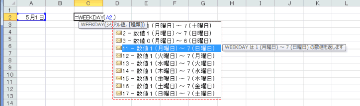 - =WEEKDAY(A2, まで入力すると、候補が表示され、クリックすると簡単な説明が表示されます。