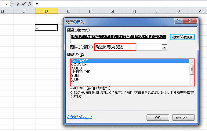 関数の分類で「最近使用した関数」を選択すると、関数名 リストボックスに最近使用した関数が10個表示されます。