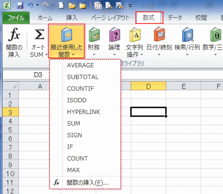 - [数式]タブの[最近使用した関数]ボタンをクリックします。