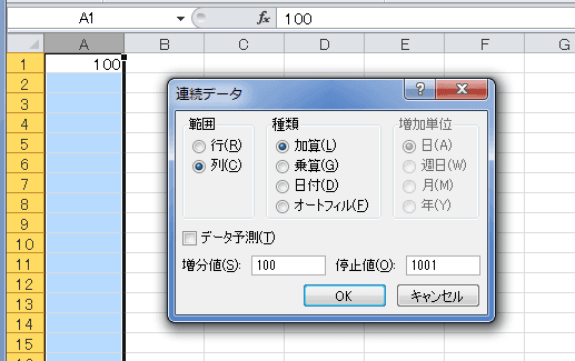- 加算にチェックを入れ、増分値「100」、停止値「1001」としました。
