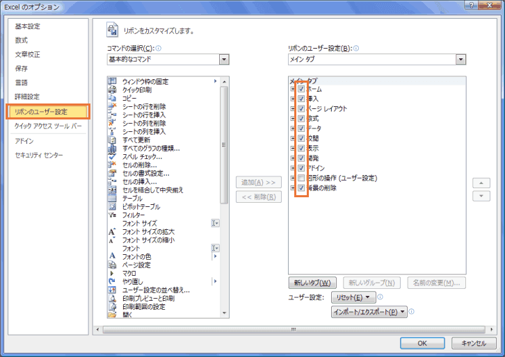 - Excel2010ではタブの表示/非表示や並べ替えができるようになっています。
