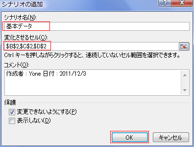 - シナリオ名に「基本データ」、変化させるセルに「$B$2,$C$2,$D$2」を設定しました。。