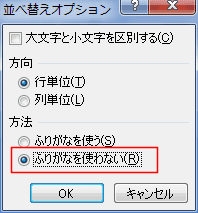 - 「並べ替えオプション」ダイアログの「方法」で「ふりがなを使わない」にチェックが入っているのを確認します。