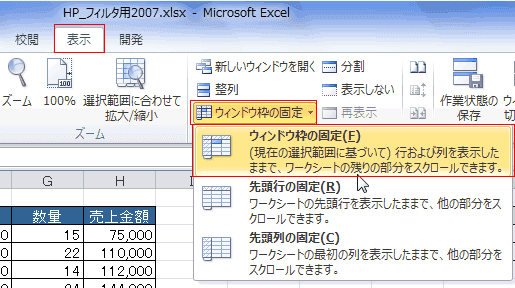 - [表示]タブの[ウィンドウ]グループにある[ウィンドウ枠の固定]→[ウィンドウ枠の固定]を実行します。