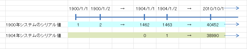 - 日付のシリアル値の違いは下図のようになります。